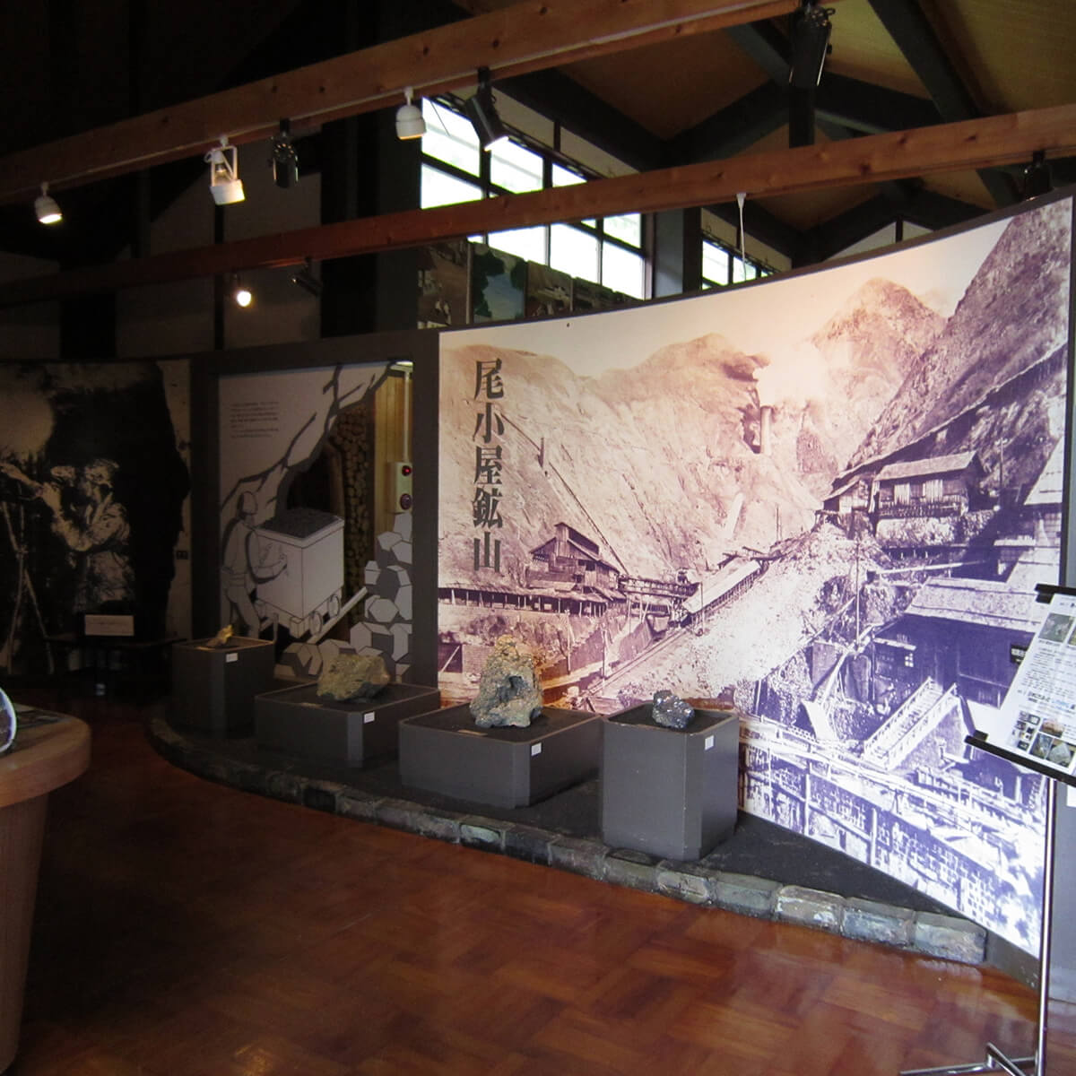 尾小屋鉱山に関する歴史的資料や鉱石や鉱物資料を紹介する「資料館」と、昔の坑道を利用した「マインロード」から成ります。